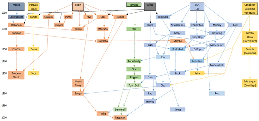 Polyrhythmik: bezeichnet die Überlagerung mehrerer verschiedener Rhythmen in einem mehrstimmigen Stück. Dabei kann jede einzelne Stimme auch einen eigenen Takt oder gar ein eigenes Metrum haben (Polymetrik).Das Bild zeigt eine Darstellung über die Entstehung der Rhythmen und Tänze mit Ihren Verbindungen, nach zeitlicher Entstehung gegliedert.